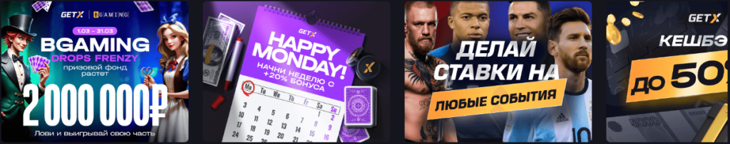 Помимо бонусов, Get X Casino регулярно проводит турниры с крупными призовыми фондами, а также предлагает еженедельный кэшбэк до 10% от проигранных средств. Активные игроки становятся участниками программы лояльности, получая дополнительные привилегии.